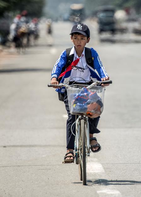 A local boy riding on his bicycle on the way to school